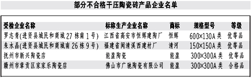 本報訊記者龔漢斌報道:近日,江西省質監局公布了近期對干壓陶瓷磚產品進行省級產品質量監督抽查的結果。質監部門共抽查了51家生產企業生產的52批次產品,抽樣合格率90.4%。抽查結果表明,本次抽查的陶瓷磚其放射性核素限量指標均達到了標準規定的要求;但仍有部分產品存在一些問題。