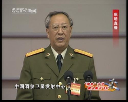 陳炳德:在這舉世矚目、激動人心的重要時刻,請允許我首先介紹一下前來視察指導(dǎo)的黨和國家領(lǐng)導(dǎo)人,親臨北京航天飛行控制中心視察指導(dǎo)的有:中共中央總書記、國家主席、中央軍委主席胡錦濤同志,中共中央政治局常委、國家副主席曾慶紅同志,中共中央政治局常委、國家政協(xié)主席賈慶林同志,中共中央政治局常委、中央紀(jì)委書記吳官正同志。親臨酒泉衛(wèi)星發(fā)射中心的有,中共中央政治局常委、國務(wù)院總理溫家寶同志,中共中央政治局常委李長春同志,中央政法委書記羅干同志,中央政治局委員、中央軍委副主席、國務(wù)委員曹剛川同志,還有全國人大、國務(wù)院、全國政協(xié)的領(lǐng)導(dǎo)。